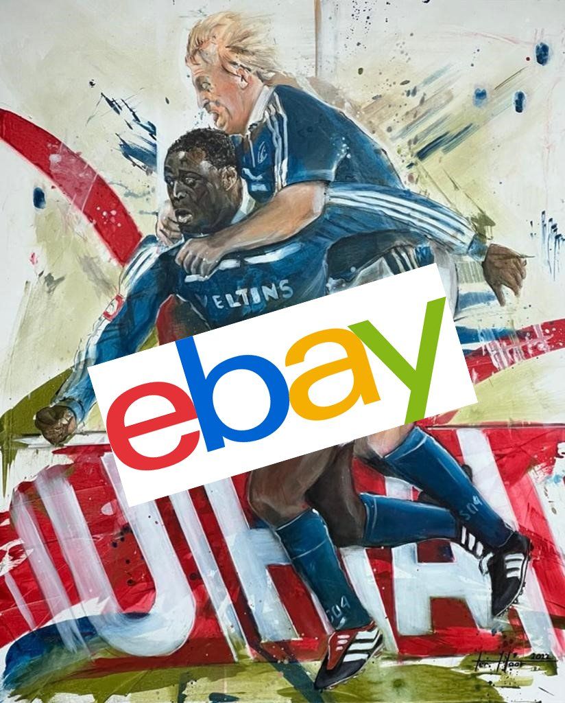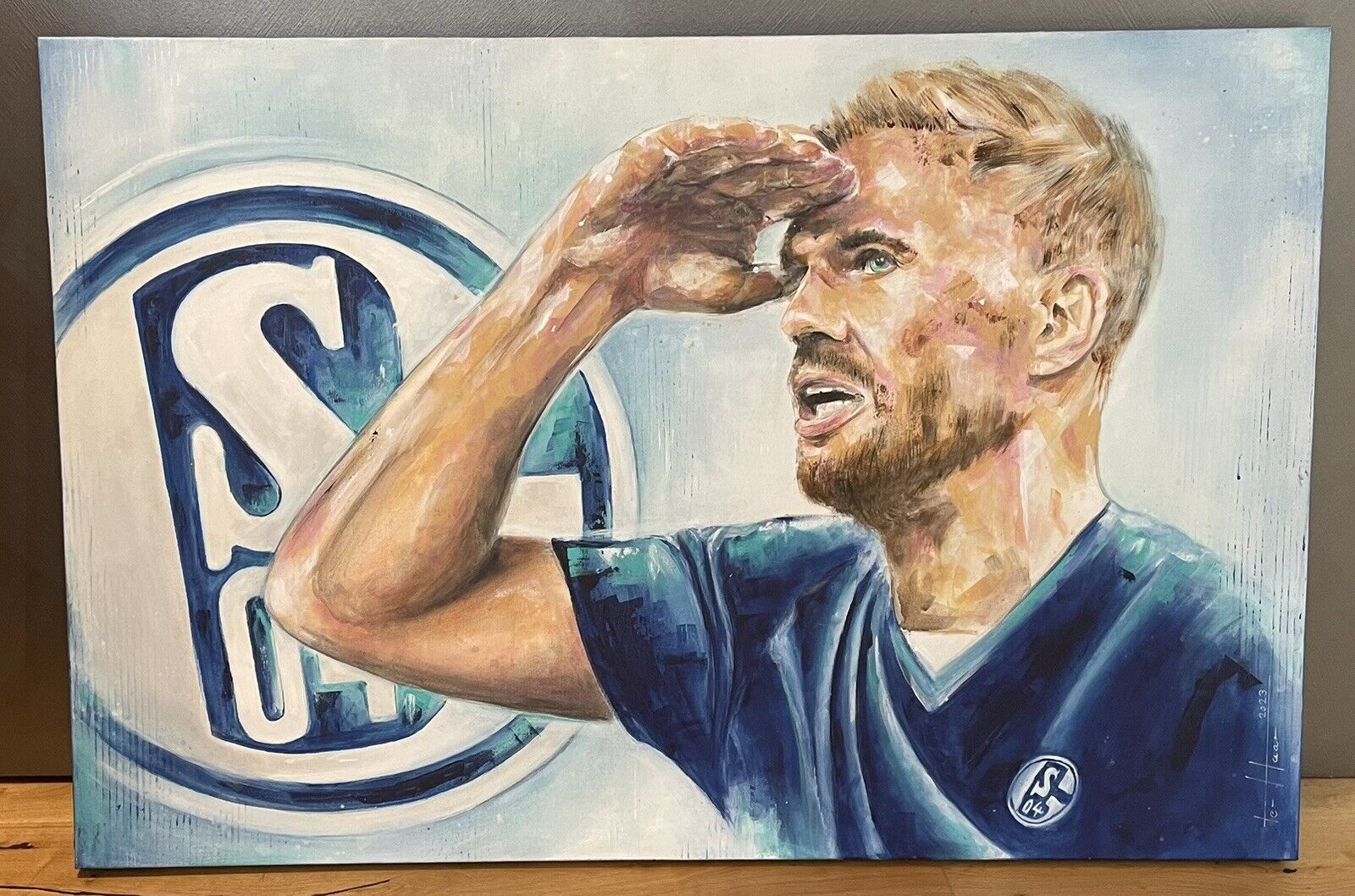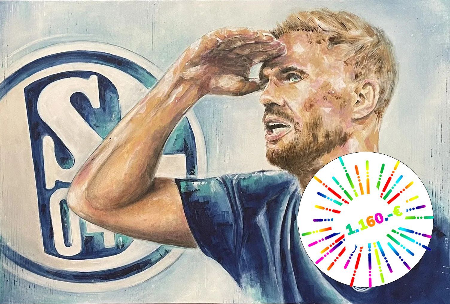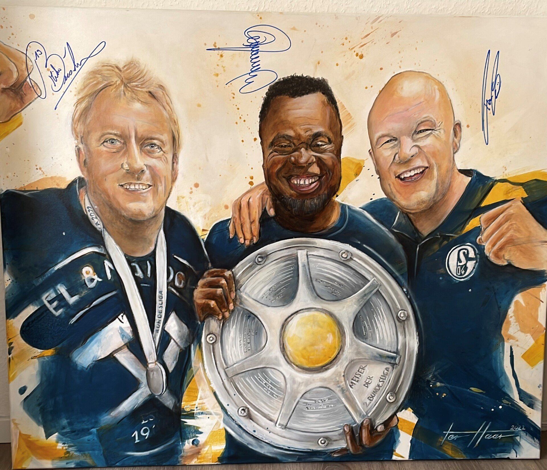 Das Gemälde wurde mittels einer Mischtechnik auf einer 120x100 cm großen Leinwand hergestellt. Es zeigt die Schalker Ikonen @Mike Büskens und @Gerald Asamoah sowie den leider inzwischen ausgeschiedenen @RouvenSchröder nach dem letzten Zweitligaspiel beim Club. Das Bild ist von allen Dreien handsigniert und kann ab sofort bei @marris Goldschmiede in Essen,Isenbergstrasse 46 begutachtet werden. Den Auktionserlös möchte ich für den großartigen Verein @rolli Rockers Sprösslinge und natürlich auch wieder für @mike.macht.Meter verwenden.